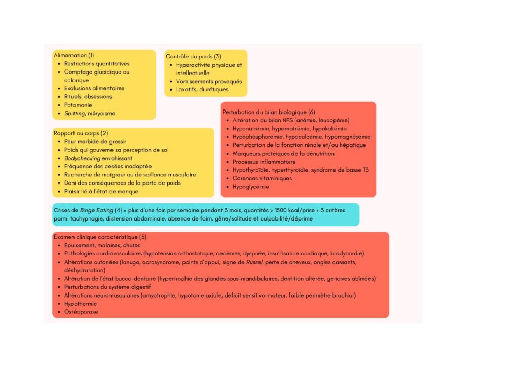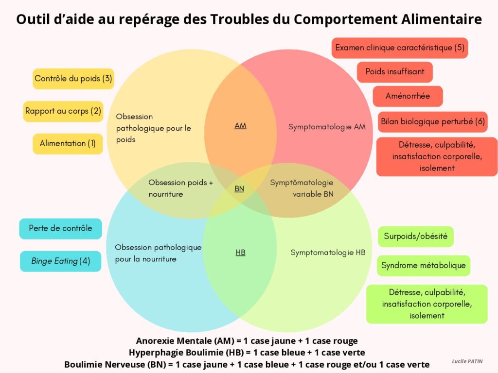Je partage ci-dessous l’outil d’aide au repérage des TCA que j’ai créé pendant le DIU TCA. Il est inévitablement incomplet car la tâche est infinie, mais il me tient à cœur dans ma pratique car il met en avant ce qui me semble essentiel : l’obsession pathologique pour le poids et/ou l’alimentation.