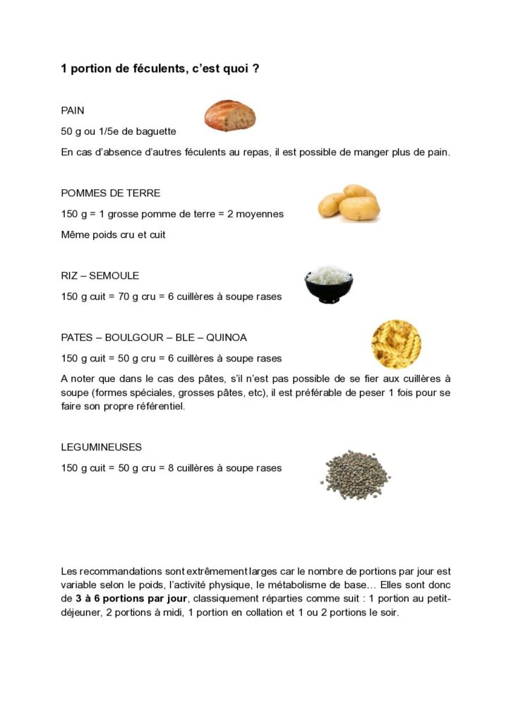 Les quantités de féculents recommandées sont extrêmement variables en fonction de nombreux paramètres (âge, sexe, métabolisme, poids, activité physique…). Toutefois, il peut être intéressant de revoir ce à quoi correspond « portion » de féculents. Les recommandations varient ensuite de 3 à 6 portions par jour et cela doit être étudié au cas par cas. C’est pourquoi je mets à disposition ce document pouvant aider tout un chacun à se faire son propre référentiel et à visualiser plus facilement ce que représente une « portion standard » de féculents :