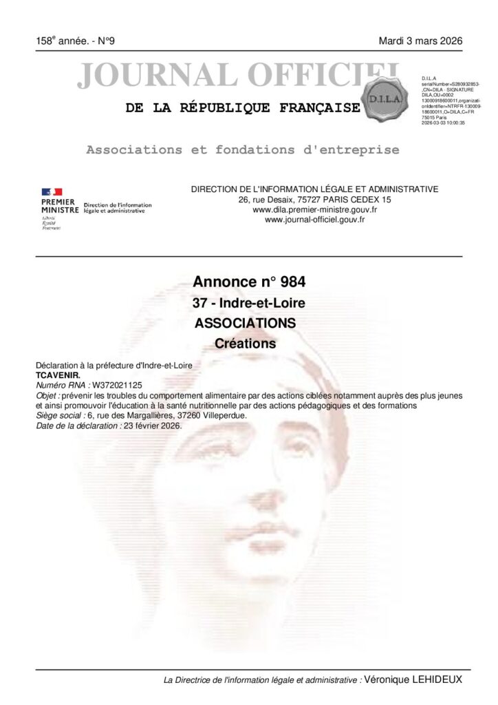 Je suis très heureuse d’annoncer la création en février 2026 de l’association « TCAvenir », au service de la prévention primaire dans le domaine des TCA, à-travers la mise en place d’actions ciblées en milieu scolaire.